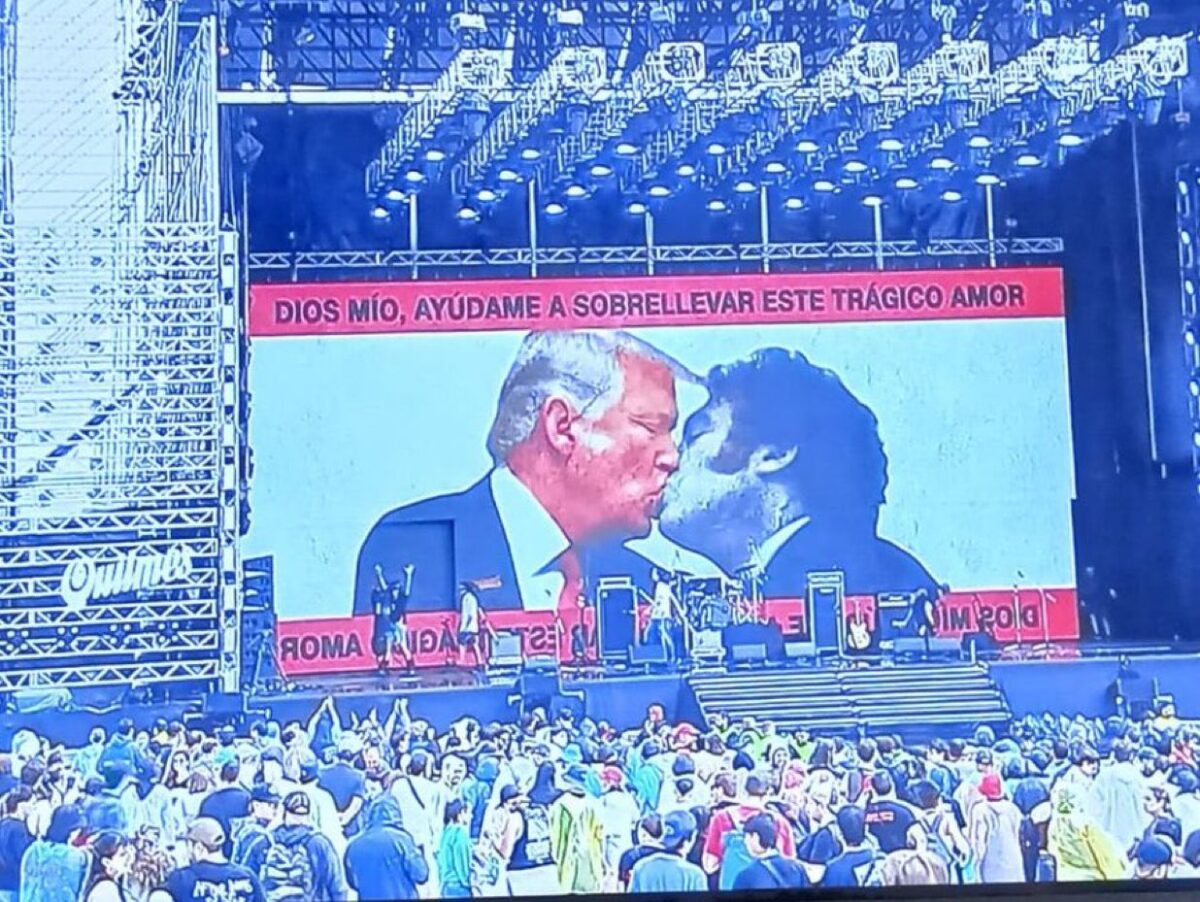 El sábado, la banda Ryan abrió la 25° edición del clásico festival de rock con una imagen editada de Javier Milei besándose en la boca con Donald Trump. Abajo, una leyenda rezaba: «Dios mío, ayúdame a sobrellevar este trágico amor».