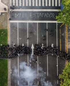 El reportero gráfico Pablo Grillo recibió el impacto de un cartucho de gas lacrimógeno en la cabeza. Sufrió fractura de cráneo y está en terapia intensiva en el hospital Ramos Mejia. Salvaje cacería de la Policía Federal, Gendarmería y Prefectura, a cargo de la ministra Patricia Bullrich. El Estado para Milei solo está presente para reprimir. Decenas de heridos –algunos de gravedad- y detenidos. El Gobierno de los hermanos Milei ingresaron en su etapa más críticas de gestión, a puro palazos, balas de goma y gases lacrimógenos.