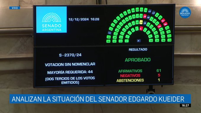 El cuestionado senador Edgardo Kueider fue expulsado del Senado de la Nación por dos tercios de los votos de los legisladores. Continúa detenido en Paraguay. La causa fue inhabilitación moral y contrabando, ya que llevaba en su camioneta una mochila negra con 211.000 dólares en efectivo, $646.000 y 3,9 millones de guaraníes, que fueron hallados por los aduaneros paraguayos