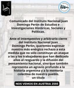 El vocero presidencial, y candidato testimonial a legislador porteño, Manuel Adorni, anunció el cierre del Instituto Nacional Juan Domingo Perón, que además implica el cierre de la Comisión Nacional de Homenaje al Teniente General Juan Perón. Último espacio en pie que perteneció al Palacio Unzué -por entonces la Quinta Presidencial, hoy ubicada en Olivos- que fue destruido parcialmente durante el bombardeo de la aviación naval del 16 de junio de 1955 sobre Plaza de Mayo, adyacencias y Recoleta, para matar a Juan Domingo Perón, el Instituto es un espacio de notable importancia cultural e histórica, cuyo cierre contiene el espíritu del nefasto decreto 4161 de los dictadores Aramburu y Rojas y forma parte del accionar embrutecedor y antipopular de los hermanos Milei y su cohorte de cíclopes, cerberos, arpías y otros monstruos que los rodean.
