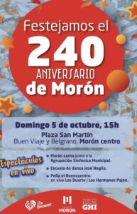 Con una programación artística para toda la familia, el próximo domingo 5 de octubre, desde las 15hs, la Plaza San Martin (Bu8en Viaje y Belgrano), será escenario de los festejos por el 240 aniversario de la fundación de Morón.