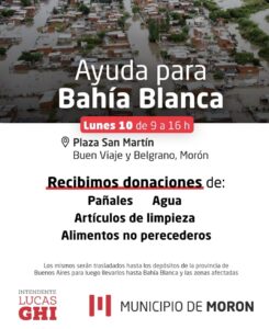 «Desde el Municipio de Morón coordinamos con la Provincia para ayudar a nuestros hermanos bahienses», informaron desde las cuentas oficiales del Municipio de Morón. Es así como la ya mencionada Plaza San Martín se convertirá en un gran punto de acopio de donaciones en donde «habrá trabajadores de este municipio recepcionando elementos que son críticos hoy para la asistencia», informó mediante un video el intendente Lucas Ghi.